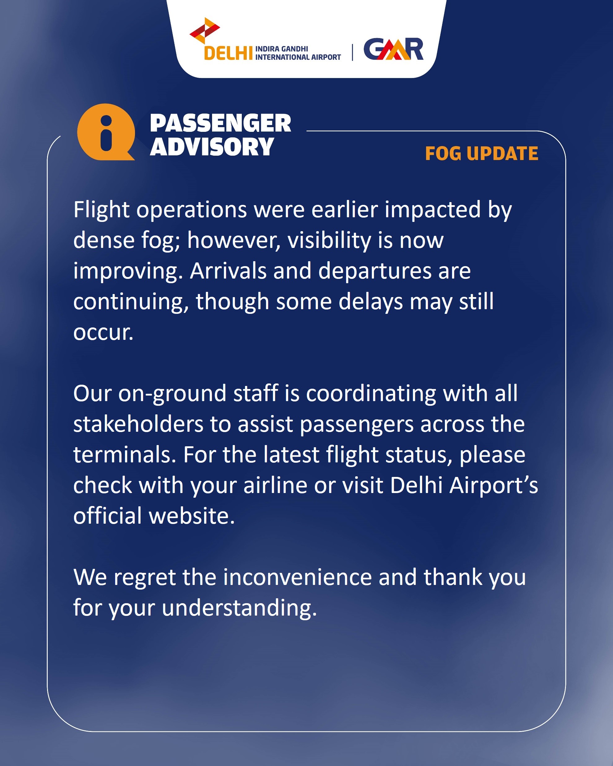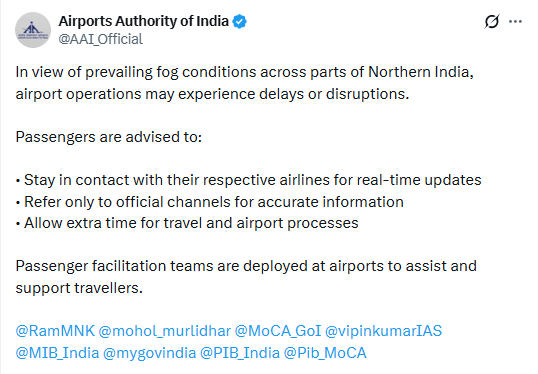 Meanwhile, the Airports Authority of India issued an advisory stating that "in view of prevailing fog conditions across parts of Northern India, airport operations may experience delays or disruptions."