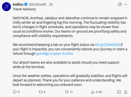 However, IndiGo, in its travel advisory, noted that fluctuating visibility in Delhi NCR, Amritsar, Jabalpur and Jalandhar has led to changes in flight schedules, adding that operations may be slower than usual as conditions evolve.