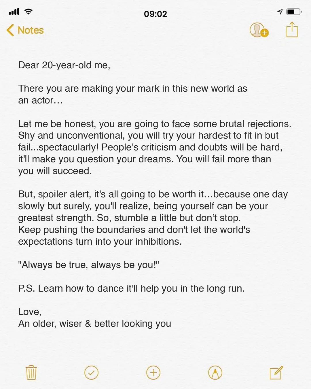 The note read, "Dear 20-year-old me, There you are making your mark in this new world as an actor. Let me be honest, you are going to face some brutal rejections. Shy and unconventional, you will try your hardest to fit in but fail spectacularly! People's criticism and doubts will be hard, it'll make you question your dreams. You will fail more than you will succeed."