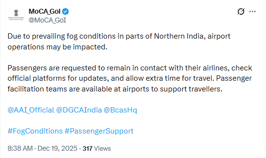 In a weather advisory posted on X, AAI said, "Persistent fog is affecting several airports across Northern India, resulting in low visibility and possible flight delays." The authority advised passengers to check their flight status with the airline before heading to the airport and to allow additional travel time.