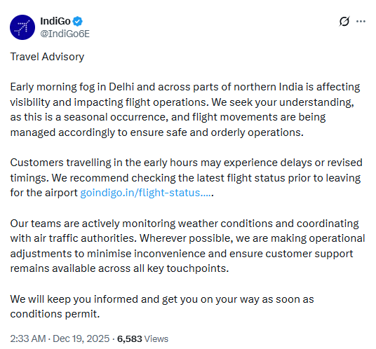 In a post on X, IndiGo wrote, "Early-morning fog in Delhi and across parts of northern India is reducing visibility and disrupting flight operations. We seek your understanding, as this is a seasonal occurrence, and flight movements are being managed accordingly to ensure safe and orderly operations. Customers travelling in the early hours may experience delays or revised timings. We recommend checking the latest flight status prior to leaving for the airport, goindigo.in/flight-status."
