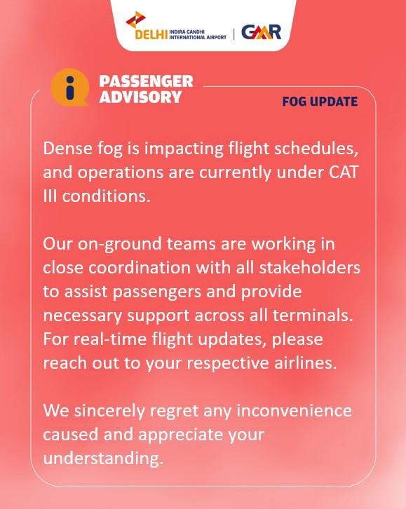"Dense fog is impacting flight schedules, and operations are currently under CAT III conditions. Our on-ground teams are working in close coordination with all stakeholders to assist passengers and provide necessary support across all terminals. For real-time flight updates, please reach out to your respective airlines. We sincerely regret any inconvenience caused and appreciate your understanding," the airport said in a statement.