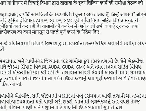 Officials informed that 1,349 ponds across 162 villages in the two districts are being connected under the project. The work is being undertaken jointly by multiple government agencies, including the Irrigation Department, AUDA, GUDA, GMC, and the Narmada Corporation.