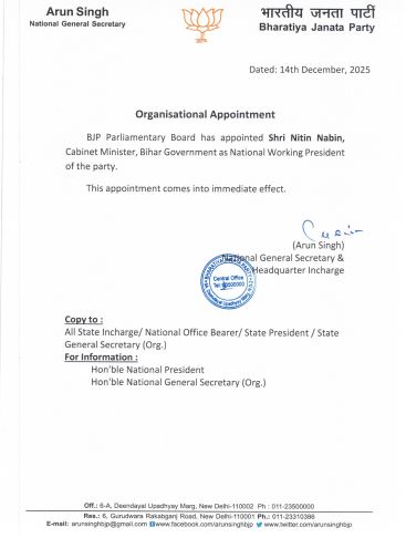 "The BJP Parliamentary Board has appointed Shri Nitin Nabin, Cabinet Minister, Bihar Government, as National Working President of the party. This appointment comes into immediate effect," a party press release said.