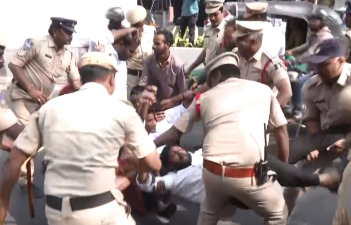 KTR's car was surrounded by party workers who expressed their anger over the SIT notice by gathering near the police station and sloganeering against the CM. Heavy police were deployed in preparation for his arrival, who tried to remove the protesters from the area.