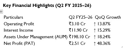 - Robust Disbursement Growth: Total disbursements grew from ₹15.38 crore in Q1 FY2025-26 to ₹35.03 crore in Q2 FY2025-26, led by strong momentum in secured MSME and personal loans.