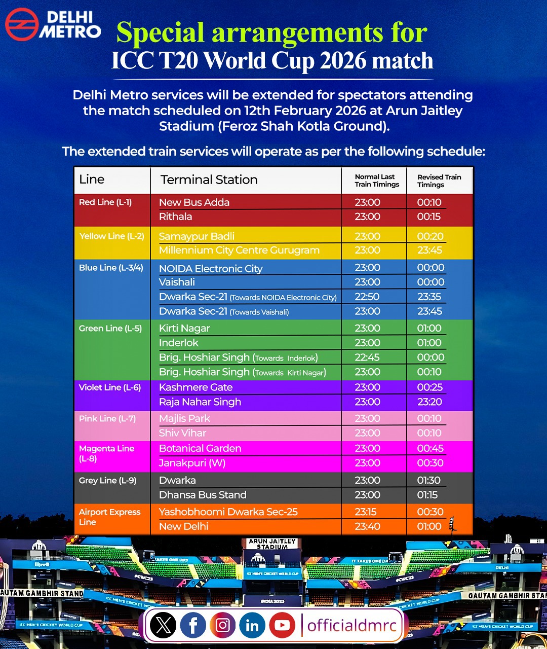 In an X post, Delhi Metro Rail Corporation shared information and wrote, "Special arrangements by Delhi Metro for the ICC T20 World Cup 2026." Delhi Metro is extending train services late into the night to facilitate the spectators attending the T20 cricket match on 12th February 2026 at Arun Jaitley Stadium."