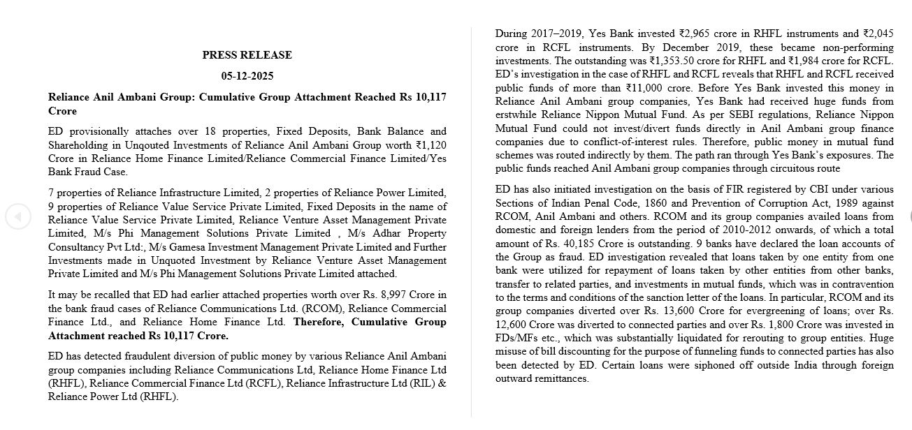 According to the ED, investigations have revealed large-scale diversion of public money by group companies, including RCOM, RHFL, RCFL, Reliance Infrastructure and Reliance Power. The agency stated that between 2017 and 2019, Yes Bank invested Rs 2,965 crore in RHFL and Rs 2,045 crore in RCFL instruments, which later became non-performing assets.