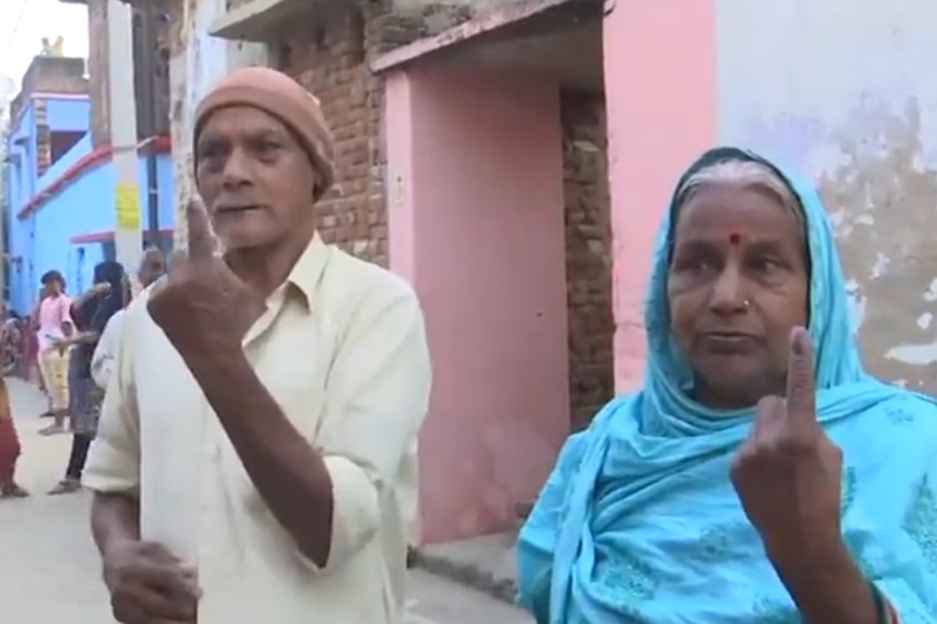 Meanwhile, an elderly couple also posed to showcase their inked fingers after casting their votes in the first phase of the Bihar elections.
