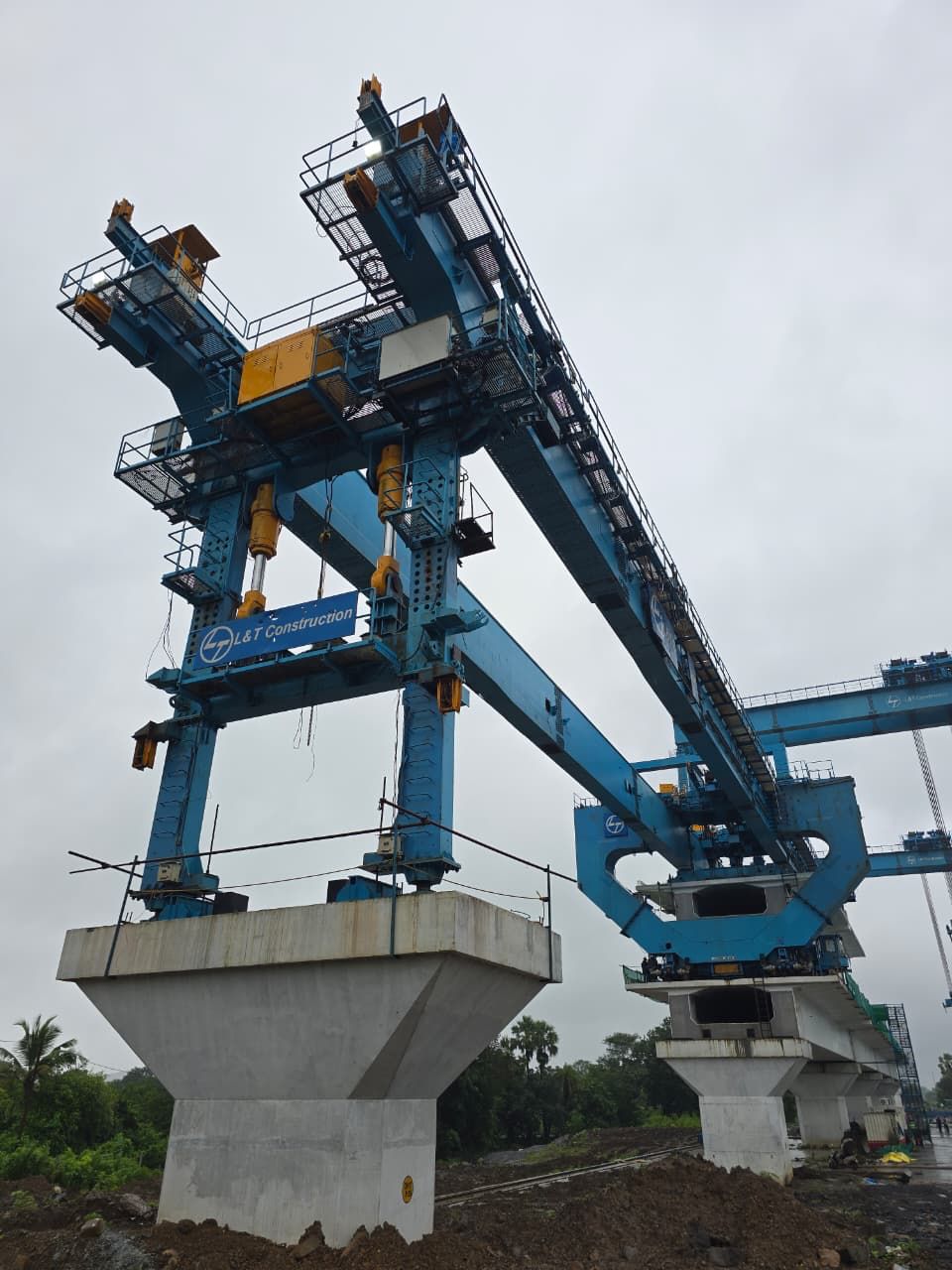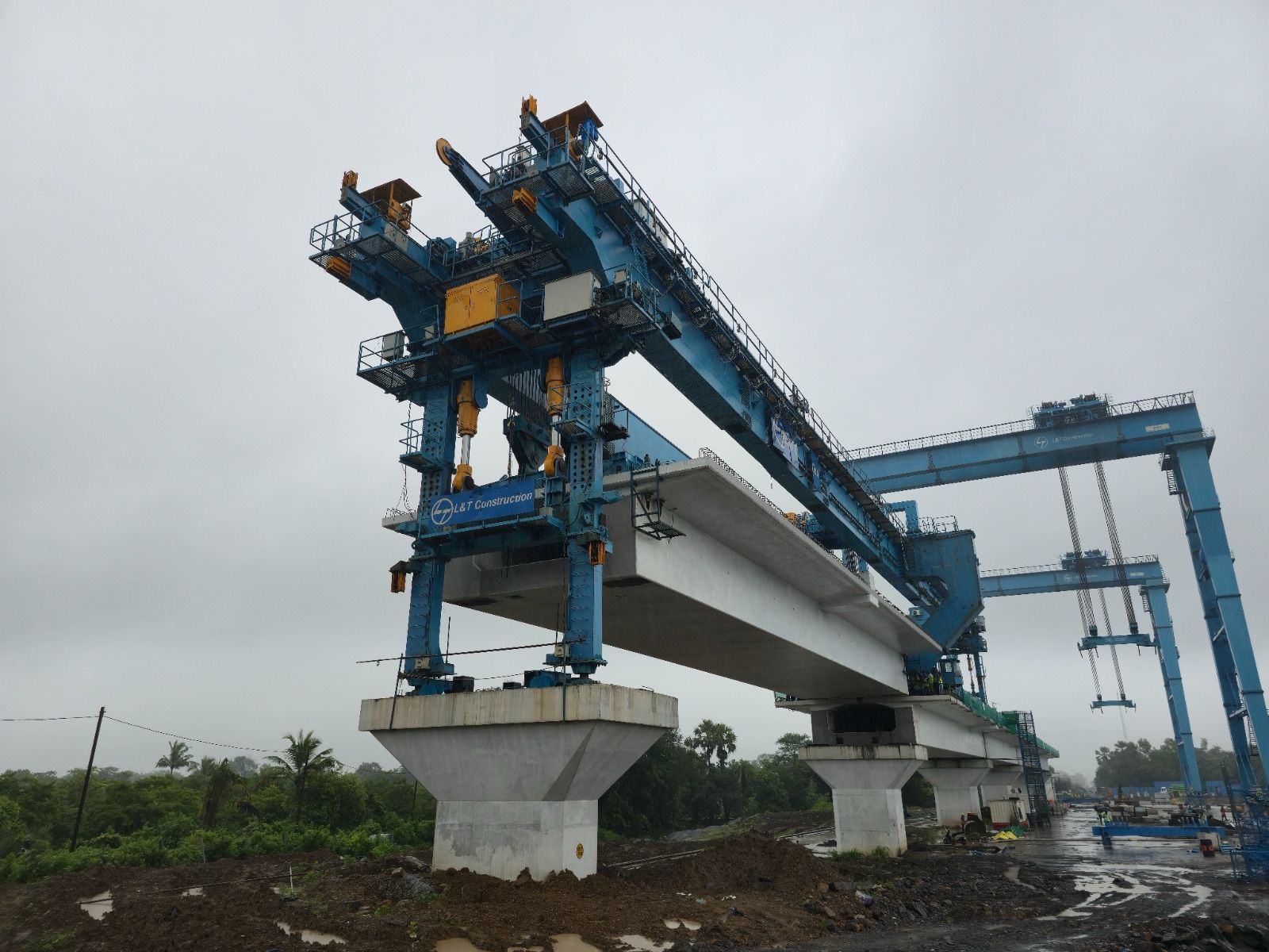 The full-span pre-cast box girders are being launched using specialized indigenous heavy machinery such as Straddle Carriers, Bridge Launching Gantries, Girder Transporters, and Launching Gantries.