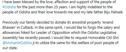 "You may kindly be aware that in the year 2015 our family decided to donate its ancestral property 'Anand Bhawan' in Cuttack to be put for use by the people of Odisha. In the same spirit, I would like to forgo the salary and allowances hiked for Leader of Opposition which the Odisha Legislative Assembly has recently passed," he added.