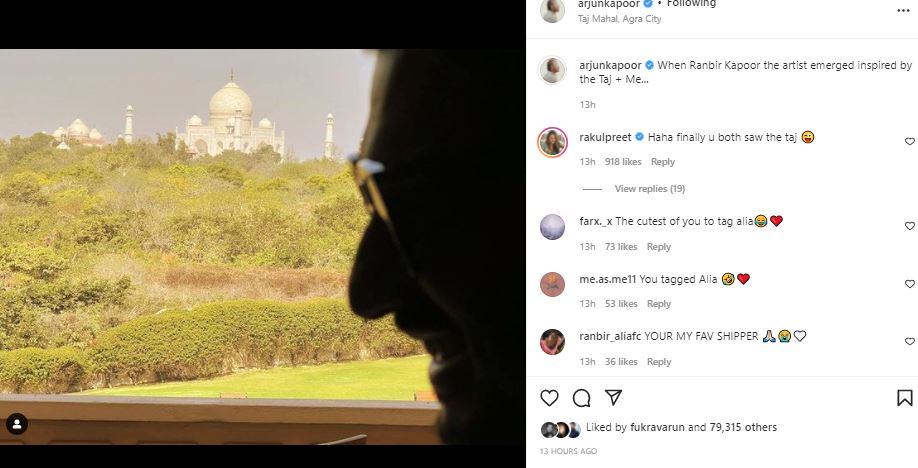 Taking to the social media application, Arjun dropped a picture of Ranbir with the Taj Mahal in the distance.