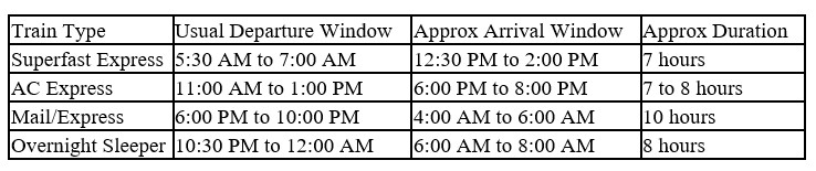 This table is only meant to help you understand the general flow of trains on this corridor. Actual timings vary by train.