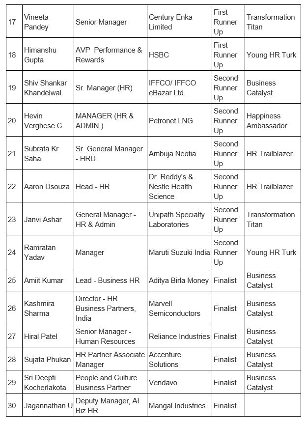 The jury's composition reflected the breadth of India's corporate landscape. Led by Sandip Ghose (MD & CEO, Birla Corps) as Jury Chair, with Ramesh Mitragotri (Group Executive President - Human Resource, Aditya Birla Group) as Jury Co-Chair, the panel included: Ashwini Prashara (CHRO, Hydrocarbons, Reliance Industries), Rajorshi Ganguli (President & Group Head-HR, Alkem Laboratories), Ayush Gupta (Director-HR, GAIL), Praveen Purohit (CHRO, Vedanta Aluminium), Subir Verma (ED & CHRO, Power Business, RP Sanjiv Goenka Group), S Parthasarathy (iMeT, EVP, L&T Technology Services), Rupesh Tripathi (Head-People and Culture, KPMG), Saba Adil (CHRO, Edelweiss), and Pooja Manocha (CHRO, Bata India).