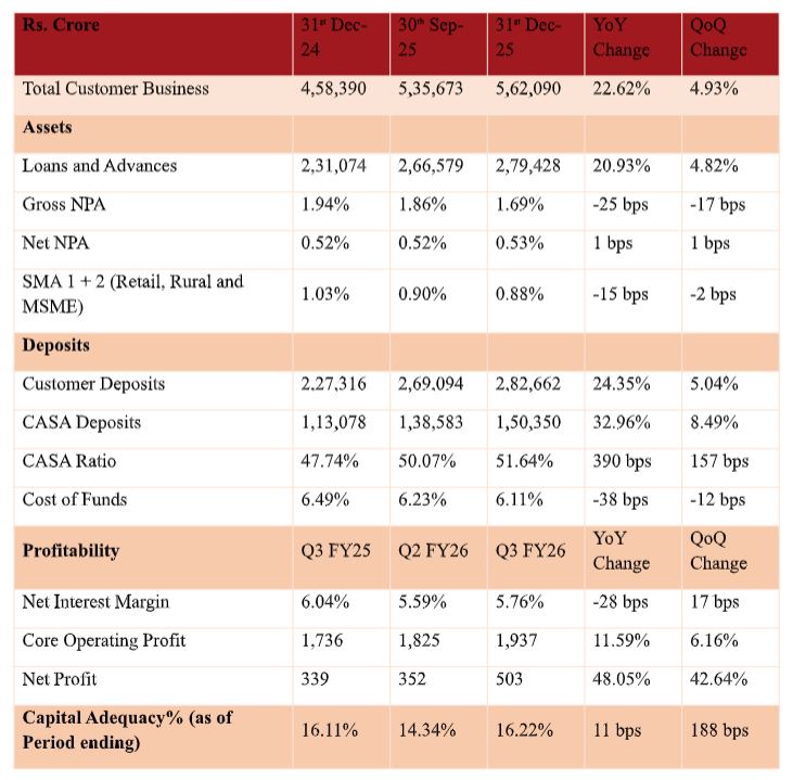 Commenting on the results, Mr. V Vaidyanathan, MD and CEO, said, "We are seeing a strong business momentum across all our main lines of businesses, including lending, deposits, wealth management, transaction banking etc. Our asset quality has improved with GNPA at 1.69% and Net NPA at 0.53% as of 31st December 2025. On cost of funds, we expect it to further drop from here because of recent revision in savings rates, which will enable us to expand our lending franchise."