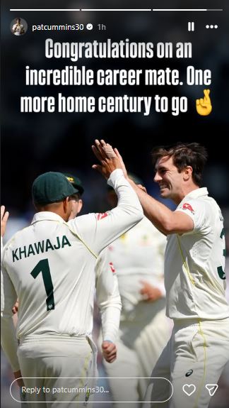 Cummins took to Instagram to congratulate Khawaja on his stellar career, while also urging the veteran to produce one final big knock at his home ground.