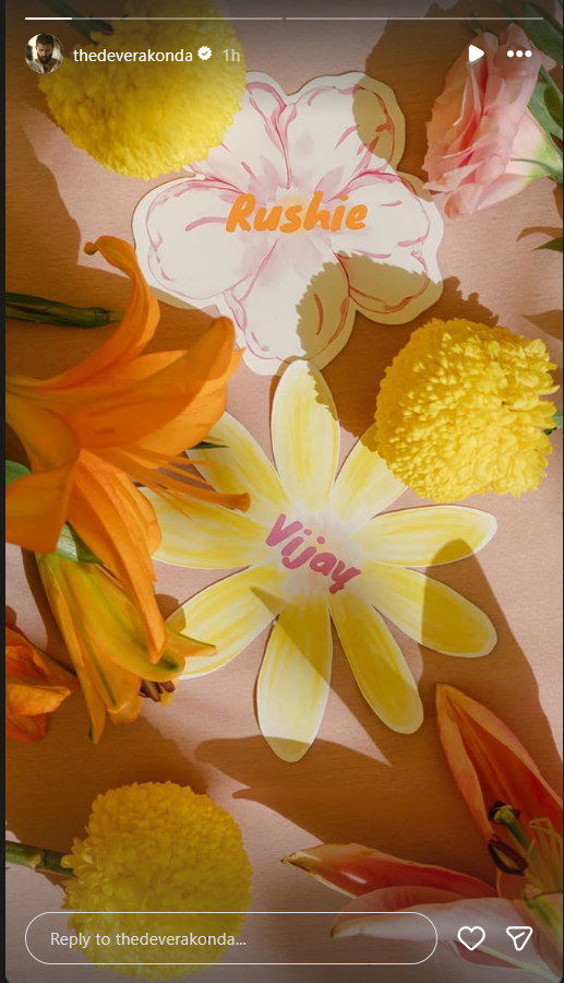 Bright yellow and orange marigold petals can also be seen in woven baskets around the area. The backdrop features floral decorations in soft, earthy colours. One detail that had every fan talking was the names on the floral cards. A flower-shaped card read "Rushie," while the other read "Vijay." The cards were placed among fresh lilies and marigolds. The decor also included animated photos of their pet dogs, making the setting feel more personal.