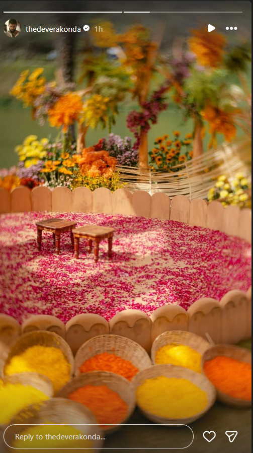 On Wednesday, Vijay took to his Instagram Story to post pictures from their Haldi ceremony venue. The ceremony appears to have been held outdoors in a simple setting. The space is arranged around a circular area with soft wooden panels. The floor can be seen covered with pink rose petals, and two small wooden stools are placed at the centre for the ritual.