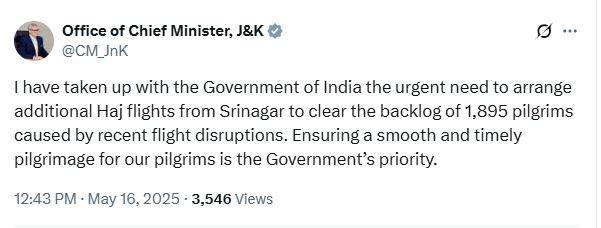 In a tweet, the J-K CM said, "I have taken up with the Government of India the urgent need to arrange additional Haj flights from Srinagar to clear the backlog of 1,895 pilgrims caused by recent flight disruptions. Ensuring a smooth and timely pilgrimage for our pilgrims is the Government's priority."
