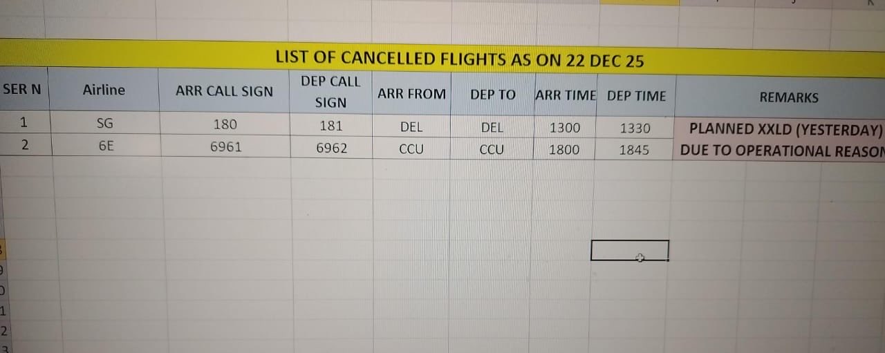 Srinagar (Jammu and Kashmir) [India], December 22 : Two flights from Srinagar airport have been cancelled by IndiGo and SpiceJet, the airport updated in a post on X on Monday.