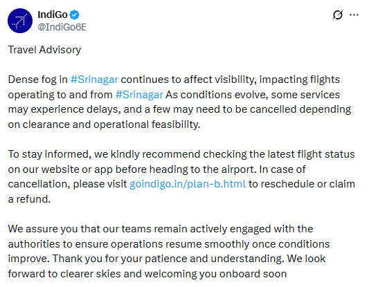 On Sunday, IndiGo issued a travel advisory informing of affected flight operations to and from Srinagar due to dense fog in the region, affecting visibility.