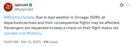 Meanwhile, SpiceJet also shared a weather update on Sunday, noting that all departures and arrivals and their consequential flights may be affected owing to bad weather in Srinagar.