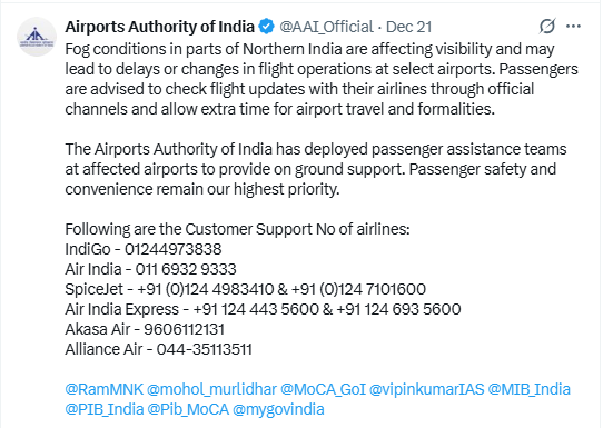 Additionally, the Airports Authority of India (AAI), on Sunday, issued an advisory noting that fog conditions in parts of northern India are affecting visibility and may lead to delays or changes in flight operations at select airports.