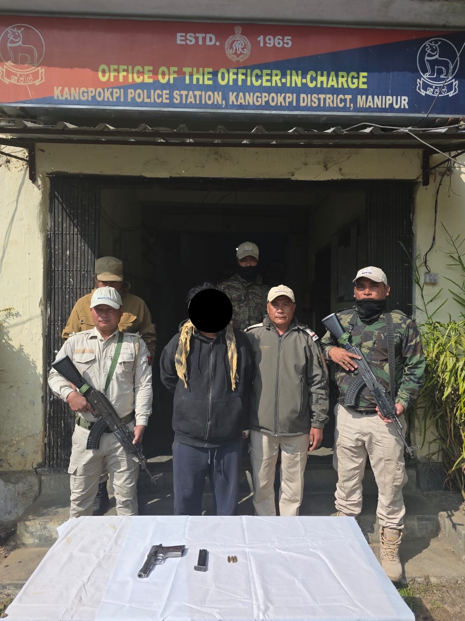 In a separate operation on January 29, Manipur Police arrested a serving Sergeant Major of the Kangleipak Republican Army (KRA), identified as Langinlal Chongloi alias Robin (36), from near the Saikul-KMC bridge under Kangpokpi police station. A 9mm pistol, along with a magazine and three live rounds, were seized from his possession.