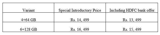 Customers can avail themselves of an instant discount of Rs 1000 online and in retail stores on both available variants 4+64GB and 6+128 GB. T&C Apply