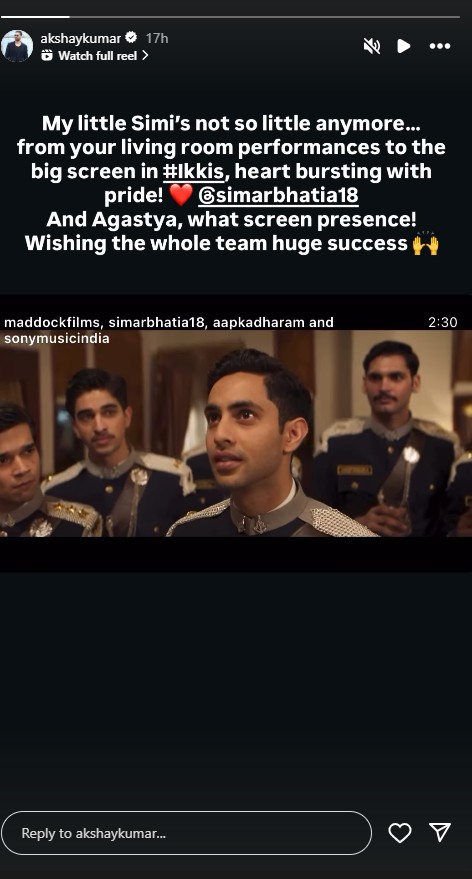Taking to Instagram, Akshay expressed pride in Simar's big-screen debut, sharing the film's trailer on his story. "My little Simi's not so little anymore... from your living room performances to the big screen in #Ikkis, heart bursting with pride! @simarbhatia18. And Agastya, what screen presence! Wishing the whole team huge success," he wrote, extending his best wishes to both Simar and her co-star Agastya Nanda.