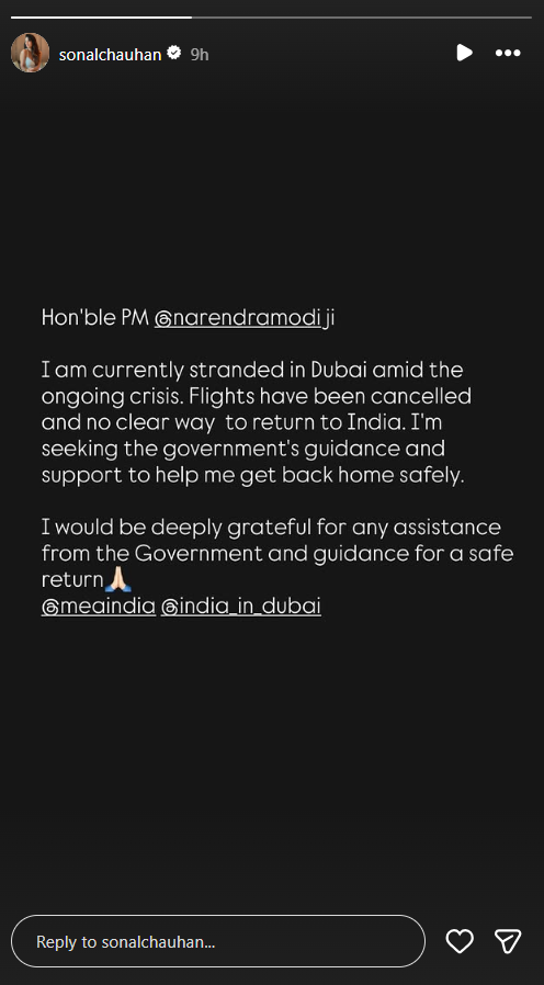 Her post read, "Hon'ble PM @Narendramodi ji, I'm currently stranded in Dubai amid the ongoing crisis. Flights have been cancelled and no clear way to return to India. I'm seeking the government's guidance and support to help me get back home safely. I would be deeply grateful for any assistance from the Government and guidance for a safe return."