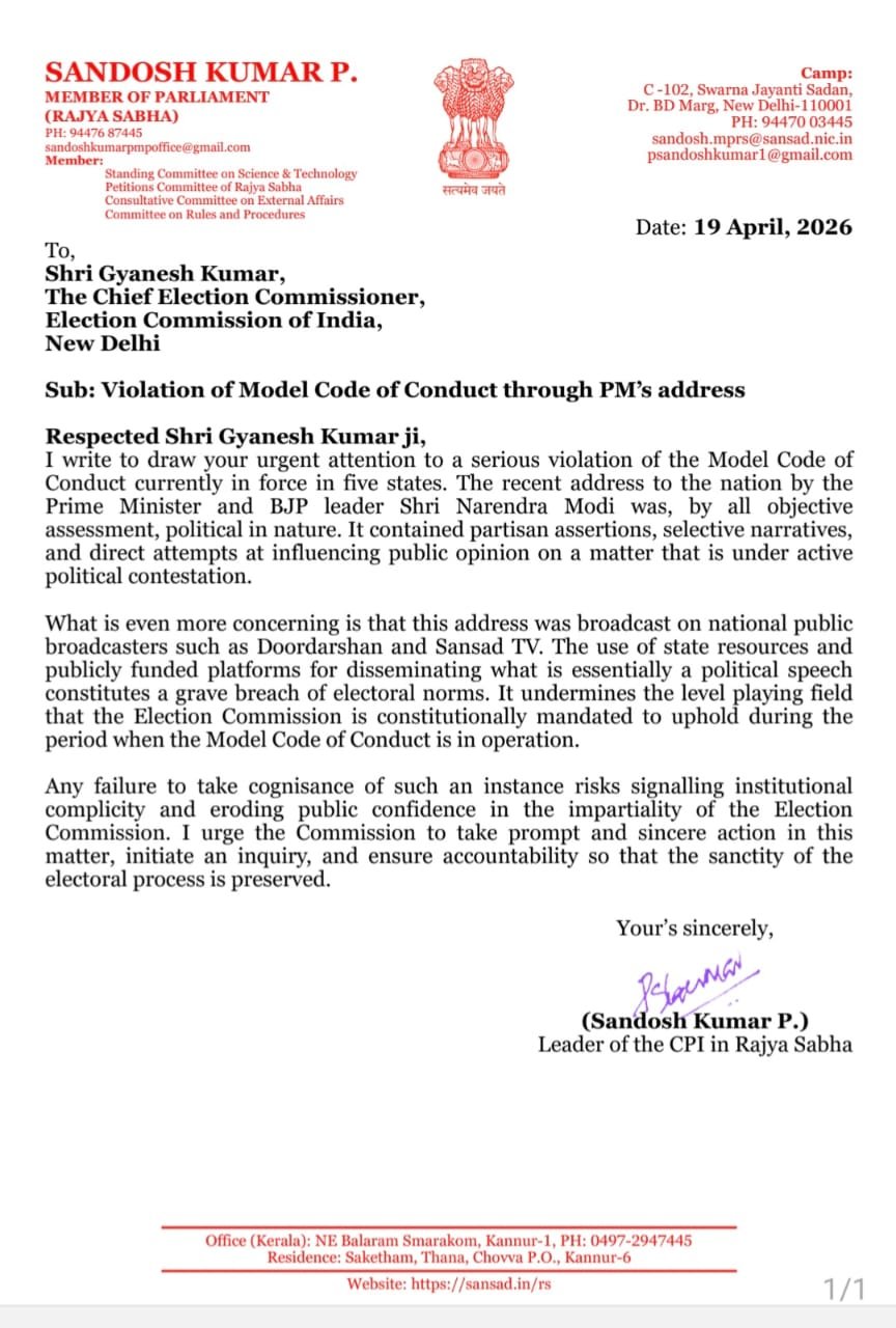New Delhi [India], April 19 : Communist Party of India (CPI) MP P Sandosh Kumar on Sunday wrote to Chief Election Commissioner (CEC) Gyanesh Kumar, alleging that Prime Minister Narendra Modi violated the Model Code of Conduct (MCC) through his recent address to the nation and sought an inquiry into the matter.