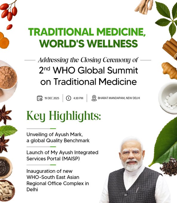 Posting about the summit on X, PM Modi said he will be taking part in the event at 4:30 PM today (December 19) and hailed the contribution of the two-day summit in advancing and discussing traditional medicine.