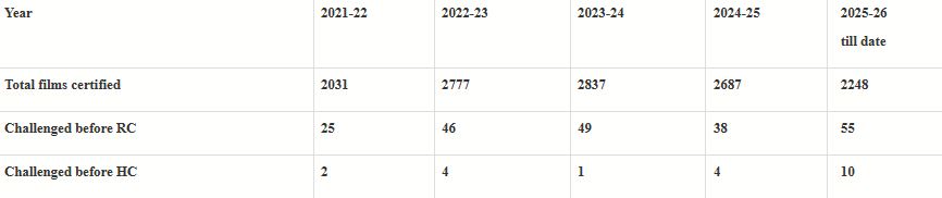 As per the year-wise details of films certified for theatre release by the CBFC, in 2025-2026, a total of 2248 films were certified, with 55 challenged before the Revising Committees and 10 before the High Court since the abolition of the Film Certification Appellate Tribunal (FCAT) in 2021.
