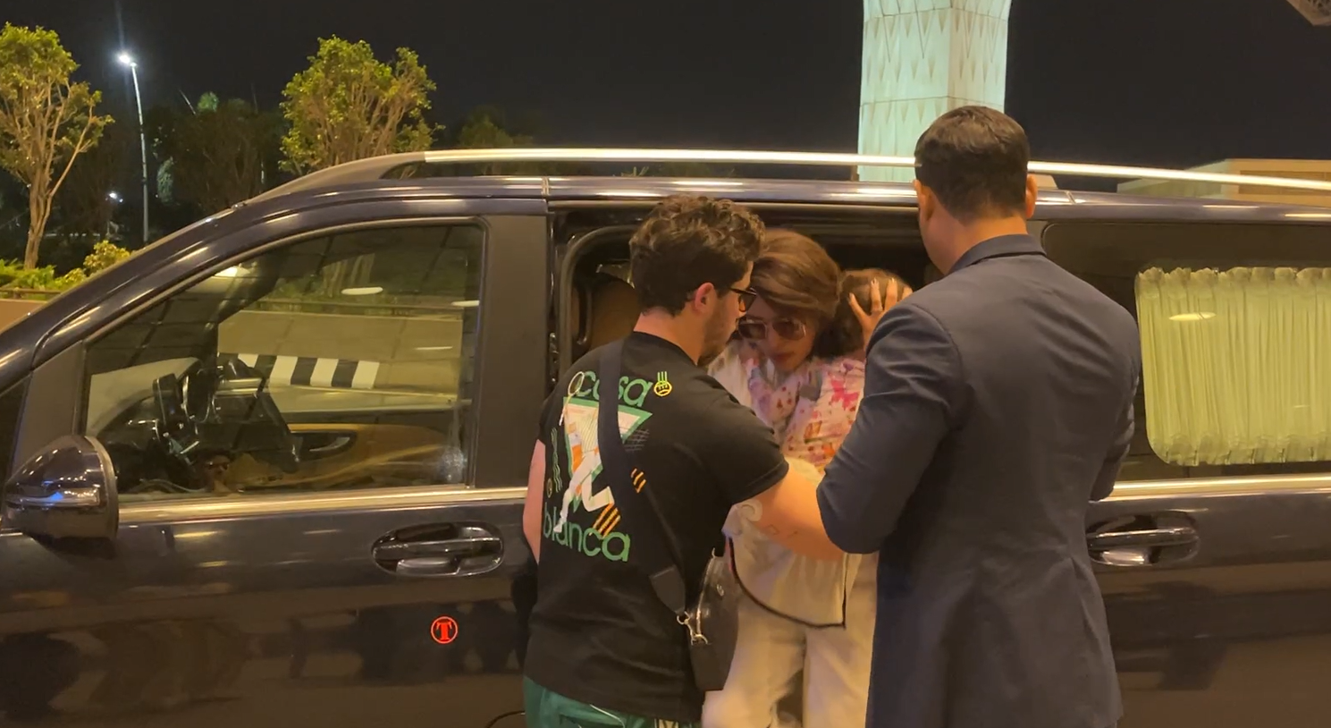 Priyanka and Nick were spotted leaving the Mumbai airport with Malti Marie. The 'Fashion' star looked effortlessly stylish in a white co-ord outfit, complete with trendy sunglasses. Meanwhile, Nick dressed casually, wearing a black t-shirt, green joggers, and white shoes.