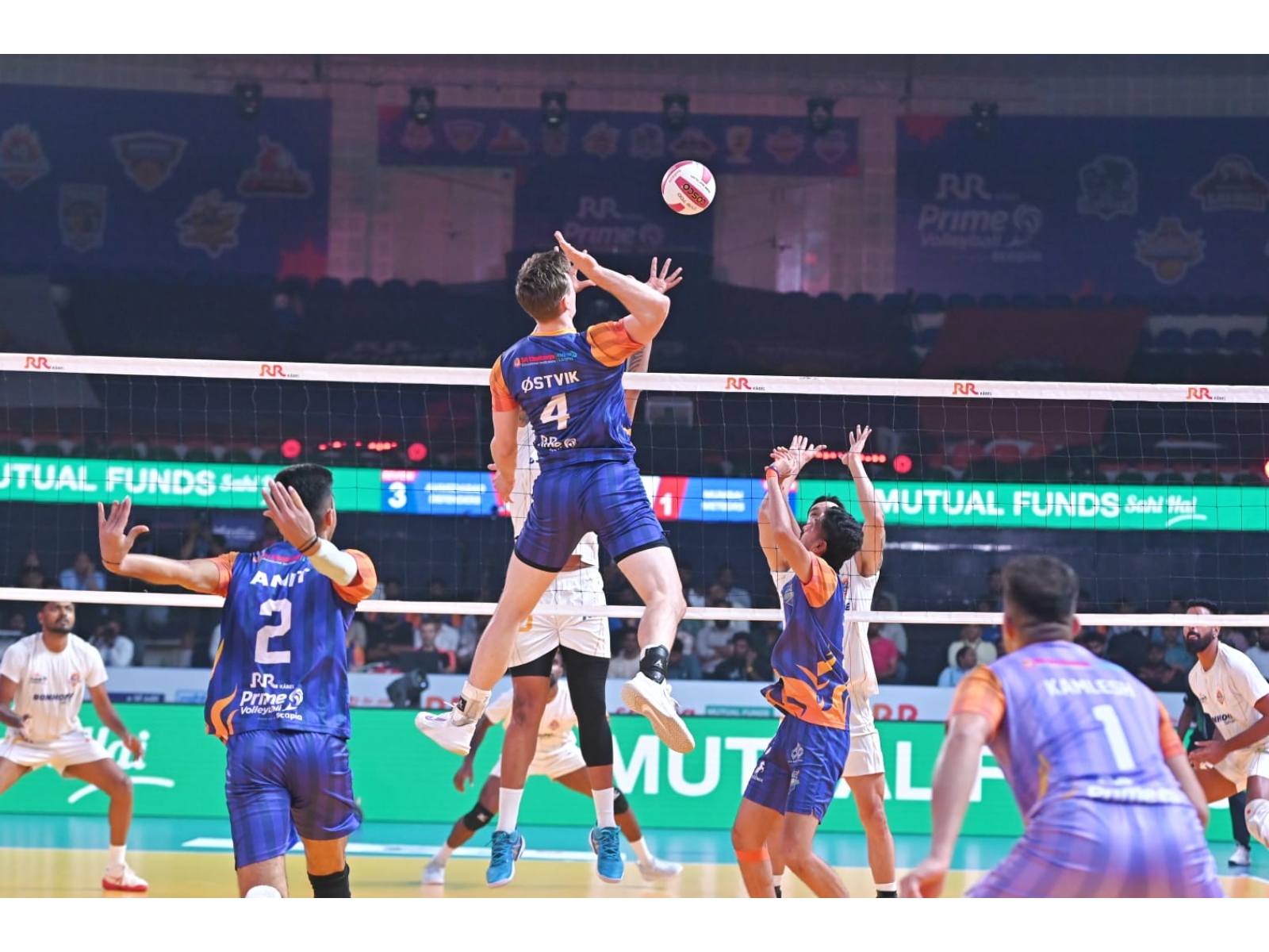 Constant attacks from Batsuuri and Angamuthu allowed the Defenders to take hold of the game. Trailing behind, Mumbai brought in the veteran blocker Karthik, whose super serve immediately put the pressure back on Ahmedabad. Nikhil's left-handed spike also added attacking flair to Mumbai.