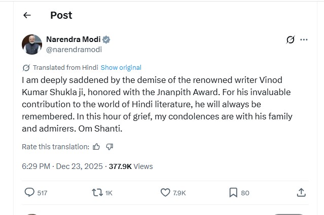 "I am deeply saddened by the demise of the renowned writer Vinod Kumar Shukla ji, honored with the Jnanpith Award. For his invaluable contribution to the world of Hindi literature, he will always be remembered. In this hour of grief, my condolences are with his family and admirers. Om Shanti," Modi wrote on X.