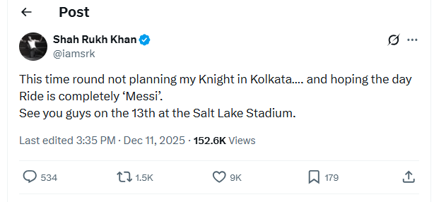 "This time round not planning my Knight in Kolkata.... and hoping the day Ride is completely 'Messi'. See you guys on the 13th at the Salt Lake Stadium," SRK posted.