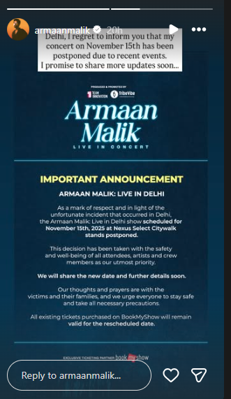 Armaan shared a note that read, "As a mark of respect and in light of the unfortunate incident that occurred in Delhi, the Aiiidon Malik Uve in Delhi show Scheduled for November 15th, 2025 at Nexus Select Citywalk stands postponed.This decision has been taken with the safety and well-being of all attendees, artists and crew. We will share the new date and further details soon.