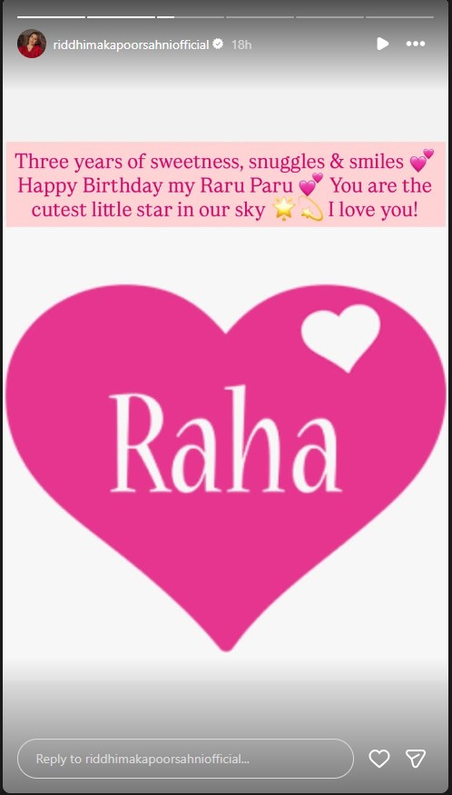 Taking to her Instagram Stories, Riddhima shared an adorable message that read, "Three years of sweetness, snuggles & smiles. Happy Birthday my Raru Paru. You are the cutest little star in our sky. I love you!" The touching note gave fans a glimpse of the adorable bond she shares with her niece.