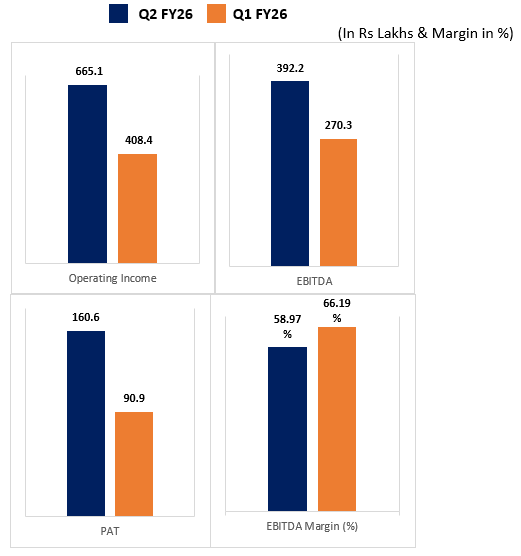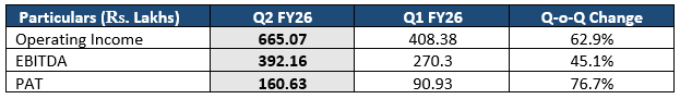 Revenue from operations reached Rs. 665.07 lakhs, marking a 63% QoQ growth from Rs. 408.38 lakhs in Q1 FY26, and a 213% YoY surge from Rs. 212.39 lakhs in Q2 FY25. This sustained momentum reflects deepening client relationships, enhanced fleet deployment, and robust demand across steel, infrastructure, and renewable energy verticals.