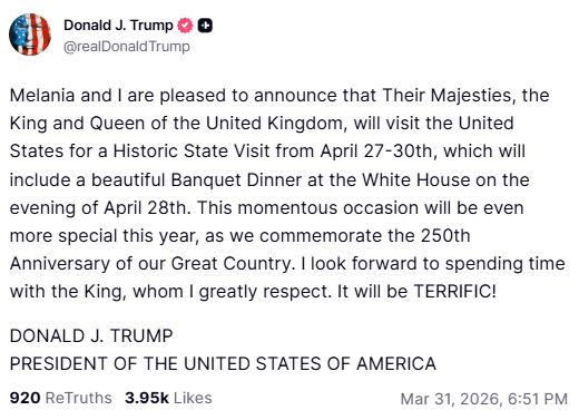 "Melania and I are pleased to announce that Their Majesties, the King and Queen of the United Kingdom, will visit the United States for a Historic State Visit from April 27-30th, which will include a beautiful Banquet Dinner at the White House on the evening of April 28th. This momentous occasion will be even more special this year, as we commemorate the 250th Anniversary of our Great Country. I look forward to spending time with the King, whom I greatly respect. It will be TERRIFIC!", he wrote.
