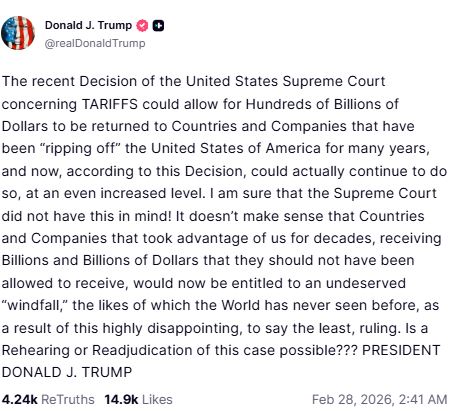 Trump raises alarm over Supreme Court Tariffs ruling; asks if rehearing is possible