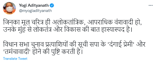 "Those whose basic character is undemocratic, criminal dynastic, talk of democracy and development from them is laughable. The list of assembly election candidates confirms that the SP is a 'rioter lover' and a 'tamanchawadi'," tweeted Yogi in Hindi.