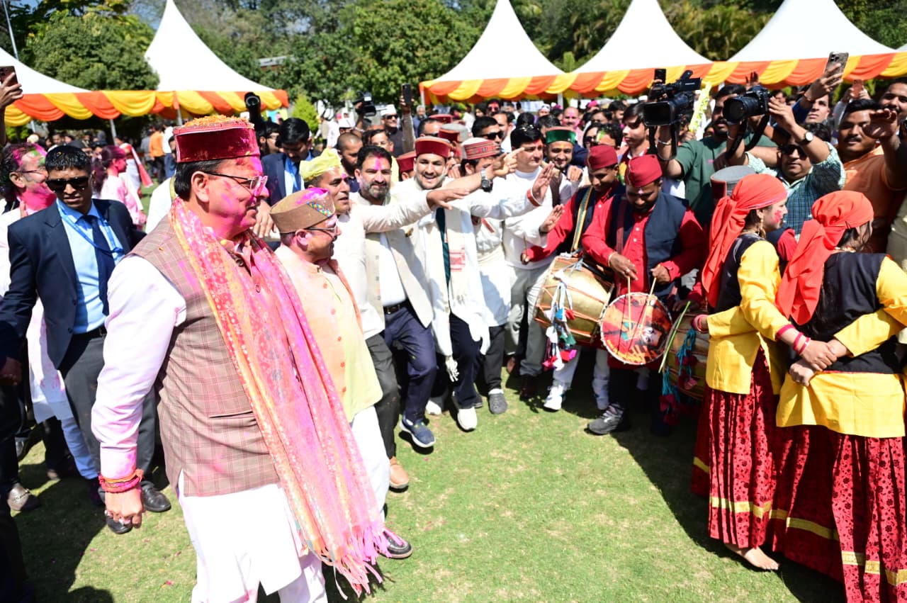 The courtyard of the Chief Minister's residence was drenched in Holi hues throughout the day, reflecting not just celebration but also the rich cultural diversity and unity of the state. From the forenoon onwards, groups of folk artists and cultural performers from different parts of Uttarakhand arrived at the residence, singing traditional Holi songs.