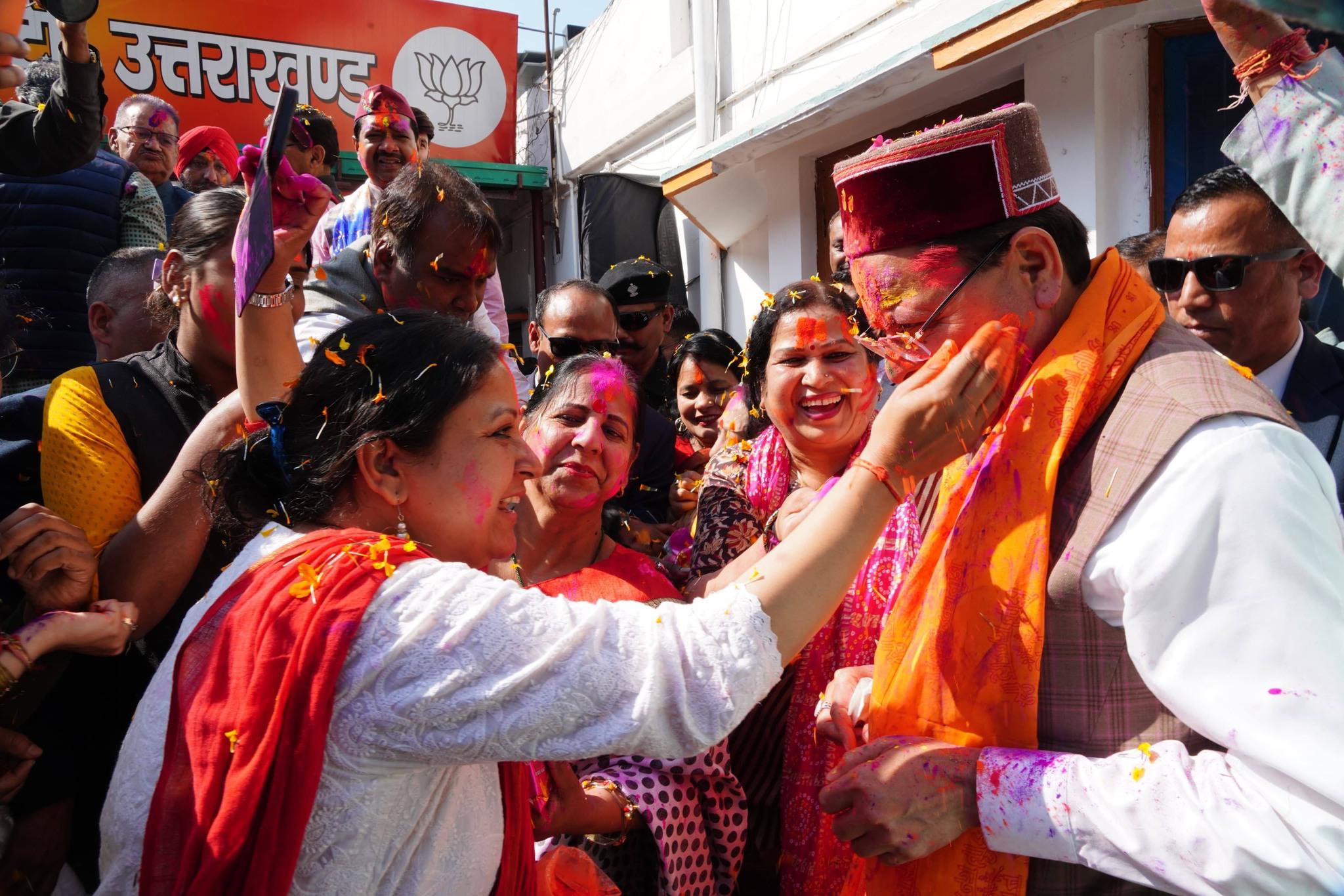 Amid the festivities, people from all walks of life extended Holi greetings to Chief Minister Pushkar Singh Dhami by applying colours to him.