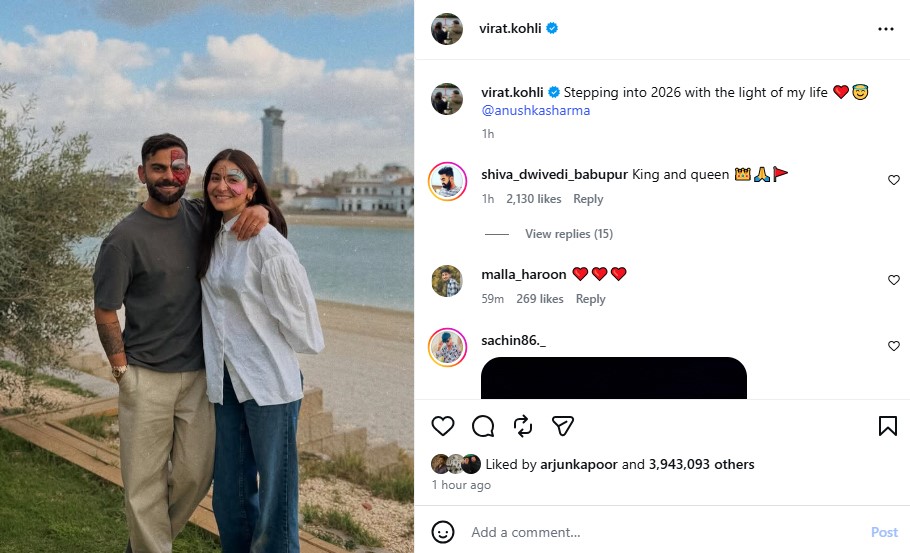 He uploaded a beautiful picture with Anushka, writing, "Stepping into 2026 with the light of my life, @anushkasharma."