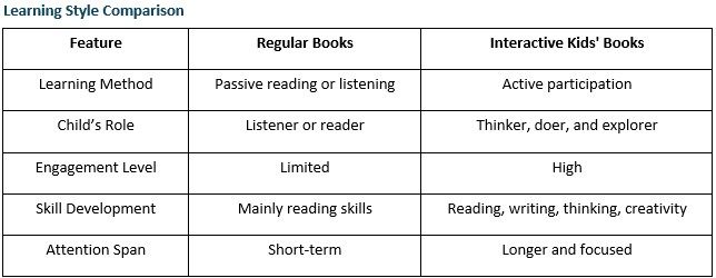 However, regular books tend to use a one-way learning approach. The child reads or listens, but there is not a lot of scope for participating. The child is still a passive learner.