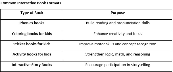 Interactive books include: phonics books, coloring books for kids, sticker books for kids, activity books for kids. Each of these formats is focused on skill-building while keeping children engaged.