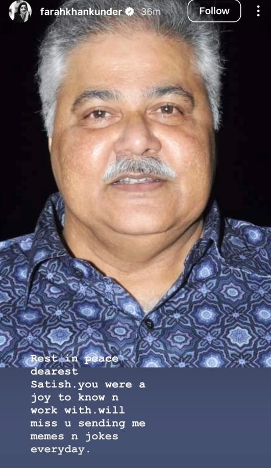 Choreographer and director Farah Khan, who worked with Satish Shah in the superhit film 'Mai Hoona Na', recalled her experience working with the actor. Farah paid tribute to the actor, saying, "Rest in peace. Dearest Satish, you were a joy to know and work with. Will miss u sending me memes and jokes every day."
